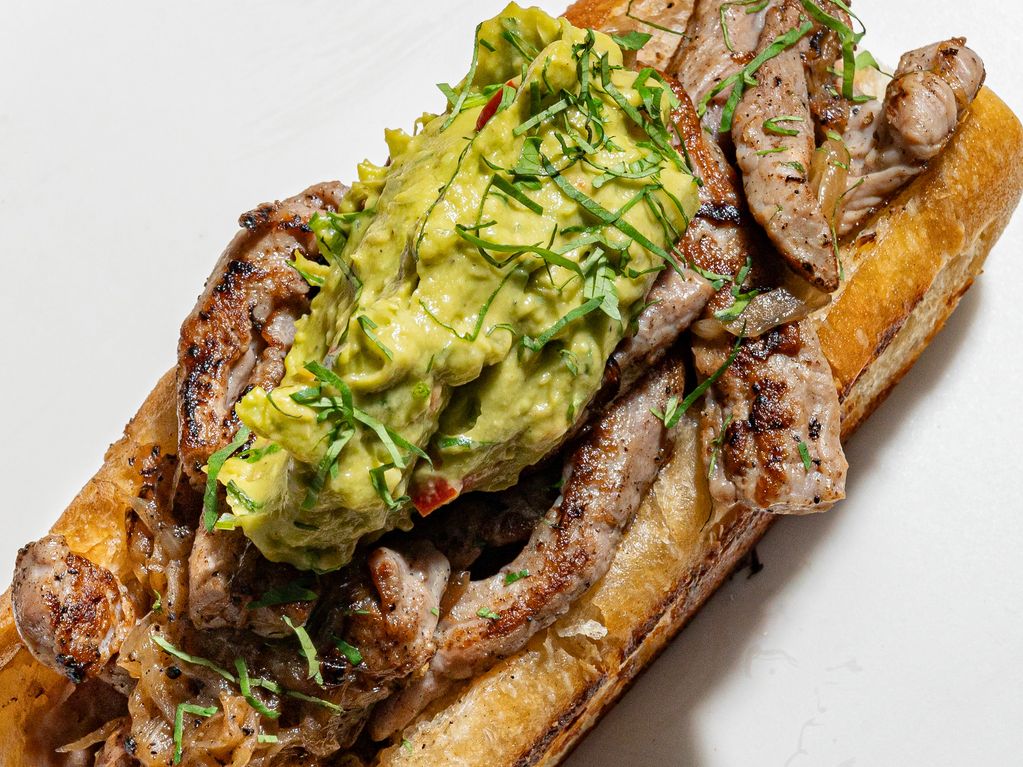 Delicioso Ribeye angus de libre pastoreo, cebolla caramelizada, guacamole y salsa de queso provolone artesanal.