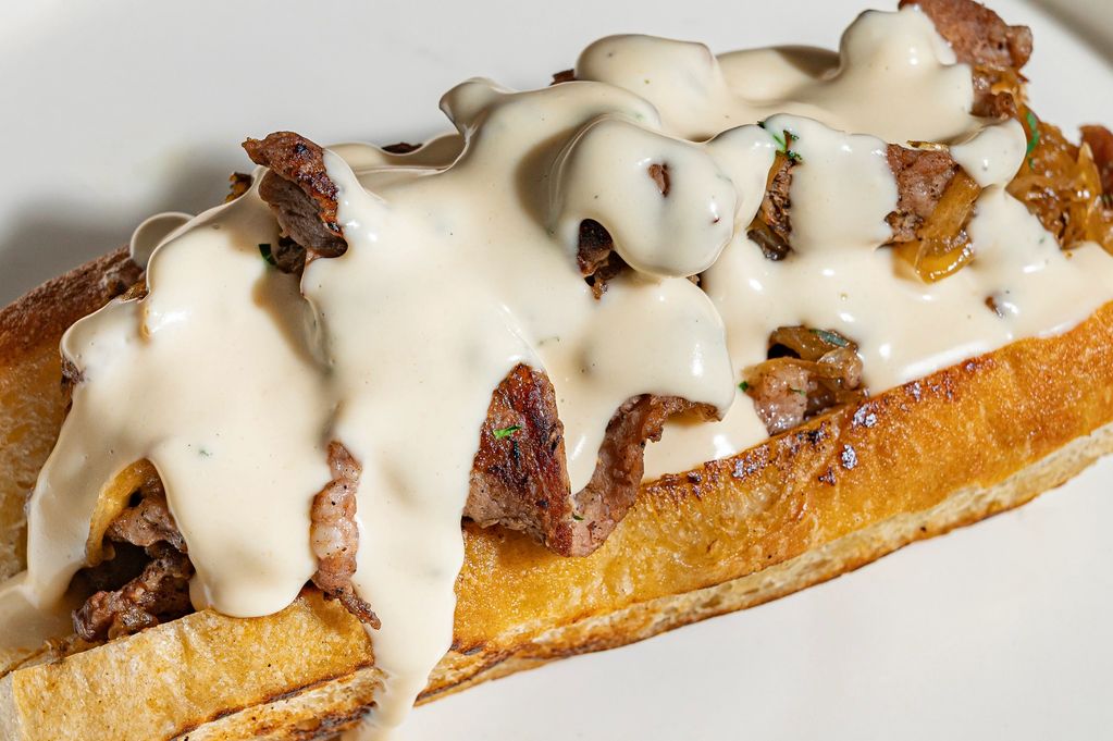 Delicioso philly cheesesteaks sandwich con jugosa costilla angus de libre pastoreo, cebolla caramelizada y salsa de queso chedar.